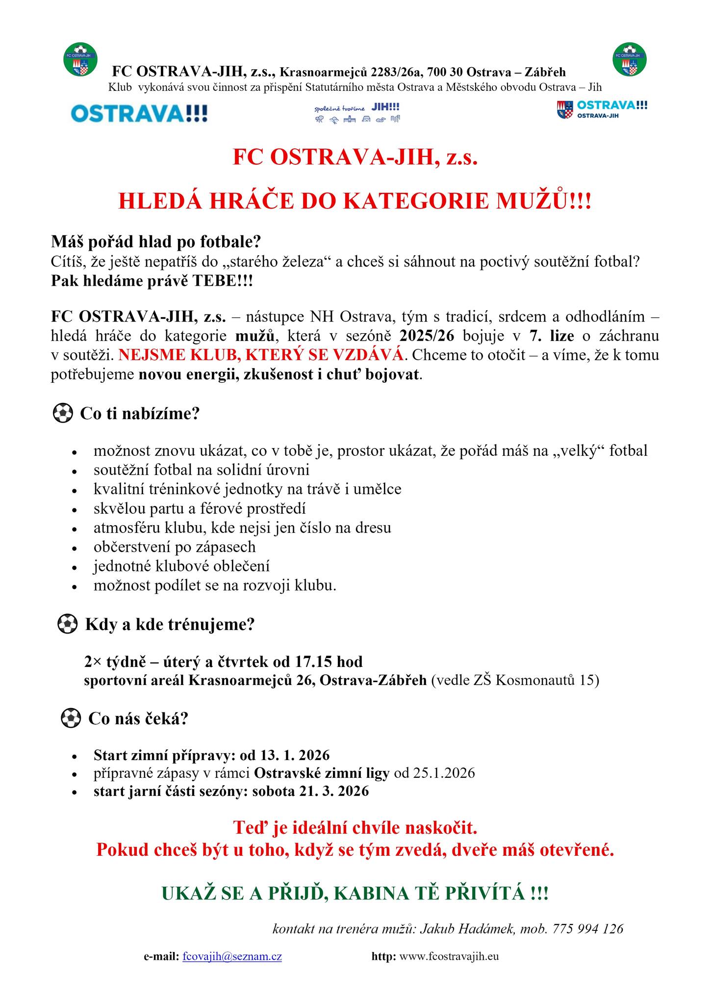 Pokud věříš, že Tvé fotbalové schopnosti mohou našemu klubu pomoci v jarní části 7. ligy, rádi Tě přivítíme na tréninku. Budeme vděčni za každého poctivého Jižana v našich řadách. Tak to zkus!!! Soutěžní utkání již od 25. ledna 2026