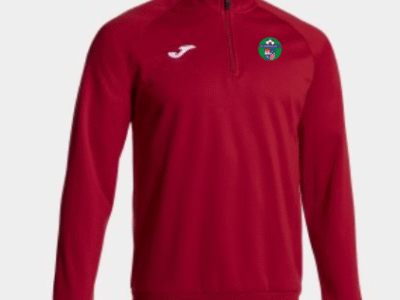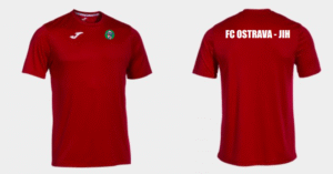 Červená sportovní mikina značky Joma s logem klubu a názvem klubu FC Ostrava jih v zádové části